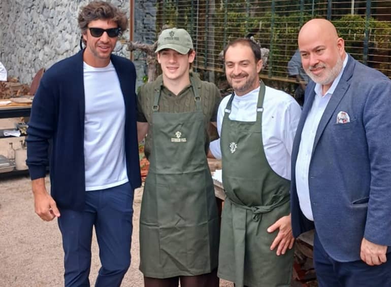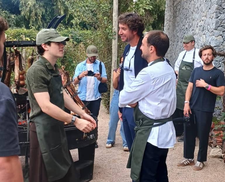 Antes del almuerzo, Colapinto recorrió el predio, los viñedos y la bodega, donde incluso brindó una entrevista para el equipo oficial de la Fórmula 1. Luego, se puso el delantal junto al chef Diego Irato y participó activamente en la preparación del asado.