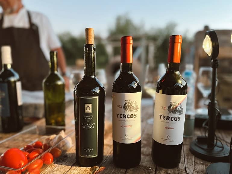 Por supuesto la oferta se completa con los excelentes vinos de Bodega Ricardo Santos, donde se podrá optar por las líneas clásicas o bien por una opción de vinos Gran Reserva. Todo acompañado de muy buena música y las maravillosas vistas de la Cordillera de los Andes y los contrastes que se aprecias desde el viñedo.