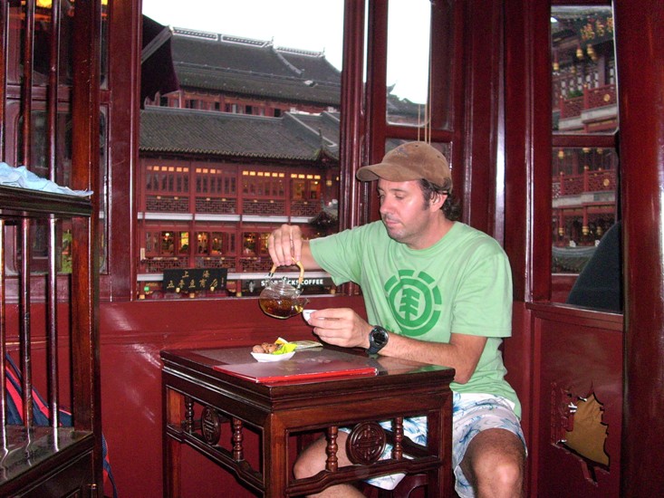 Degustando un té en la Huxinting Tea House en los jardines de Yuyuan.