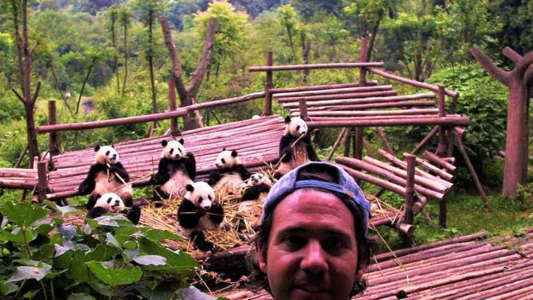 Luego de caminar 10 minutos entre senderos selváticos escuché un extraño sonido y los incesantes clicks de las cámaras de fotos. El foco de atención eran ocho pandas que comían sus brotes de bambú sobre una plataforma de madera. Algunos estaban literalmente acostados sobre la comida y se llevaban el tierno bambú a la boca con las dos manos.