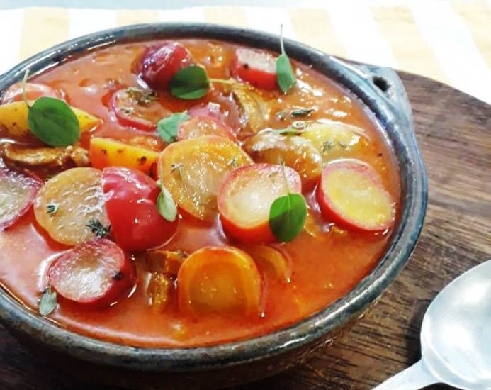 «Cazuela de cabrito con papas norteñas». Vino sugerido: Malbec Gran Reserva 2017, Bodega Piattelli, Cafayate.
