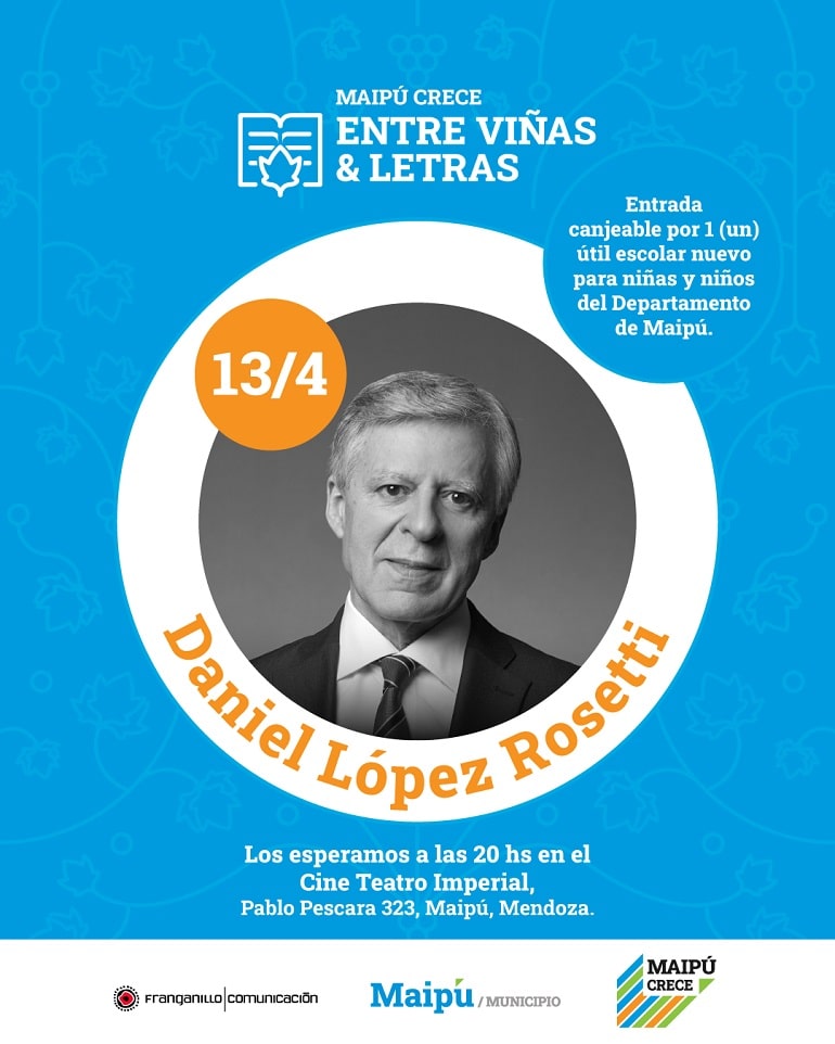 Tras los éxitos de Darío Sztajnszrajber, Eduardo Sacheri, Felipe Pigna y Claudia Piñeiro, este jueves 13, a las 20, el doctor Daniel López Rosetti será el encargado de cerrar al ciclo de charlas en el Cine Teatro Imperial de Maipú.