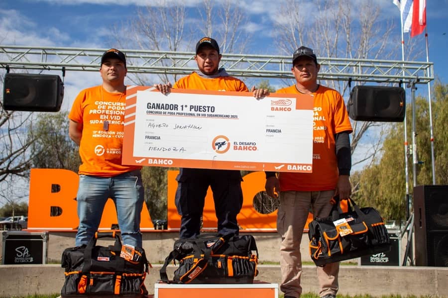 -Jhonatan Aguero, de Bodega Andeluna, quien se consagró campeón y viajará a Francia para visitar la planta de BAHCO y representar a la región en un concurso internacional. Aguero recibió su premio de manos del presidente global de BAHCO, Jeff Zuelhs, quien viajó especialmente al país para la ocasión.