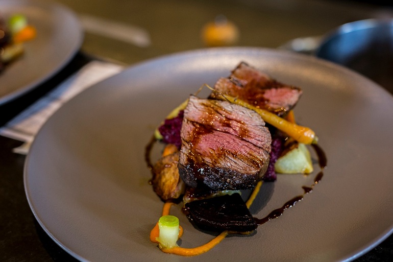 “Al momento de crear un plato principal, ponemos en valor los productos de la zona trabajando los sabores del acompañamiento de un filet mignon y agregando técnica a productos como los tomates y pimientos, comenzando desde el asado de los mismos, para luego realizar mermeladas, como así también, un cremoso de papas andinas y hongos de pino”, sugiere Miguez.