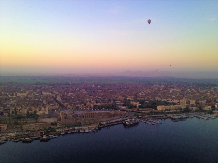 En la madrugada del día siguiente desayunamos en una barca navegando por el Nilo para cruzar a la otra orilla donde nos esperaba una aventura distinta. Pude cumplir uno de mis anhelos de viajero: volar en globo aerostático. Despegamos al amanecer hacia la bóveda celeste con vistas asombrosas del Valle de los Reyes, el Nilo y la ciudad de Luxor. La altura máxima alcanzada fue de 500 metros. Cuando el piloto deja de inyectarle calor al globo se produce un silencio relajante que permite observar el paisaje con total tranquilidad.