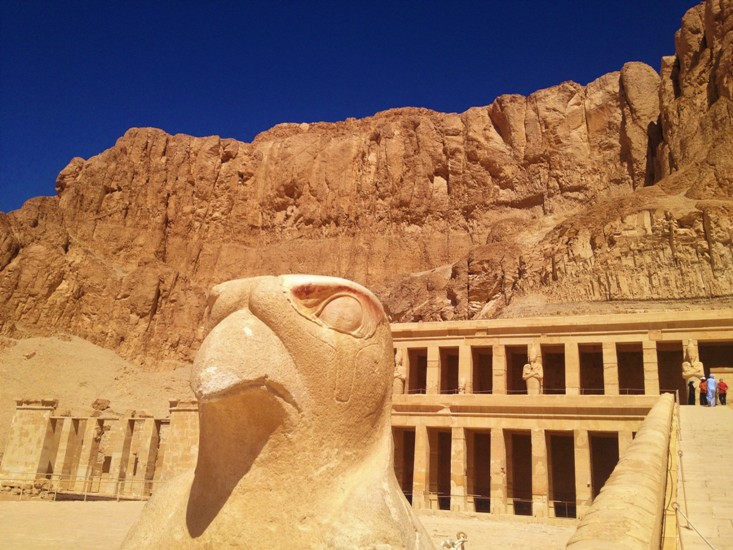 Después de desayunar mirando el Nilo desde la terraza del hotel cruzamos en ferry público hasta la otra orilla. Llenos de ansiedad y cargando mucha agua, partimos hacia la tumba de Tutankhamon. Es la única que llegó intacta hasta nuestros días. Fue descubierta en 1922 por Howard Carter. Nos detuvimos en el Templo de Hatshepsut, diseñado por el arquitecto Senemut quien fue su amante. Está bellamente tallado en la roca y se mimetiza con las montañas y los barrancos que lo rodean.