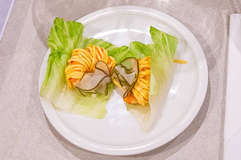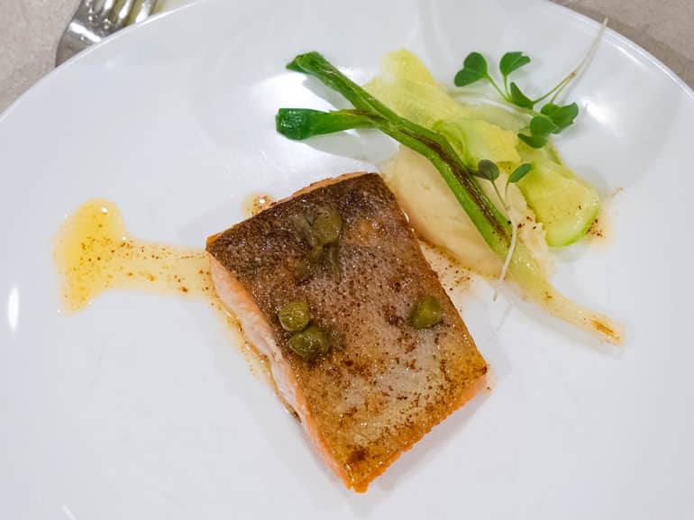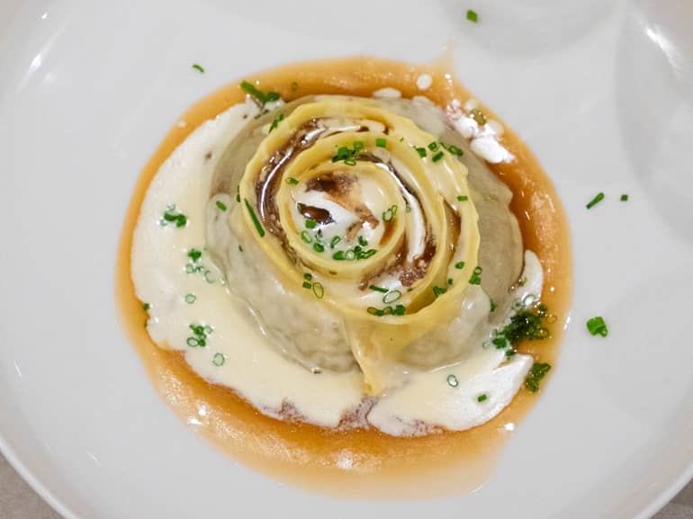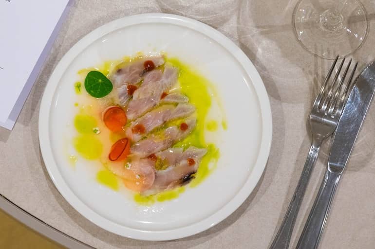 Langostinos crocantes, Pesca fresca curada, Pesca del día a la manteca negra con vegetales y brandada, un Raviolón de ternera braseada con crema de parmesano y Membrillos caseros con mascarpone dieron forma a un menú donde cada paso encontró su correlato en el vino.