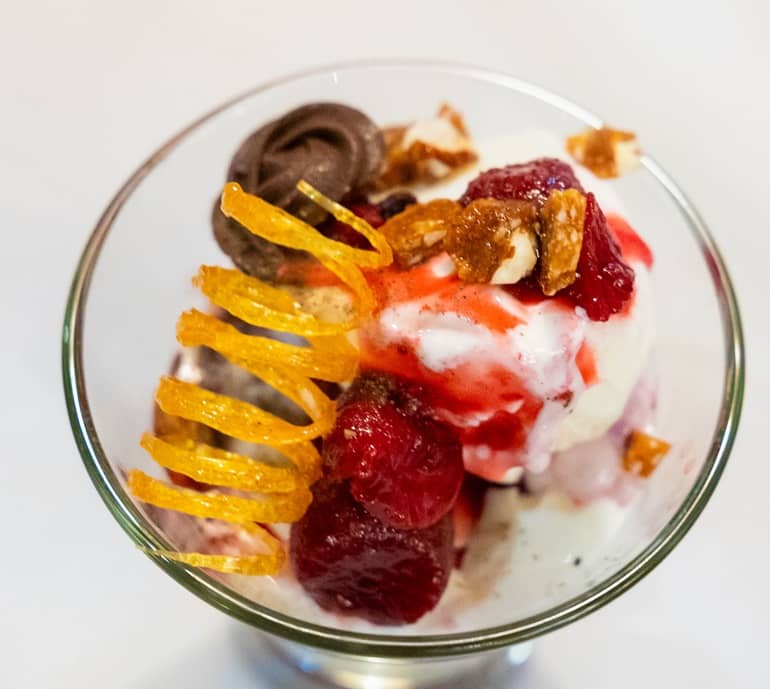 Crema americana, frutos patagónicos, pimienta negra, láminas de chocolate y praliné de almendras.
