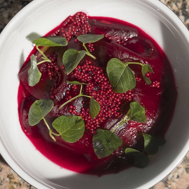 Relish de remolacha, mostaza de remolacha, frutillas, salsa de mani y carpaccio de remolacha.