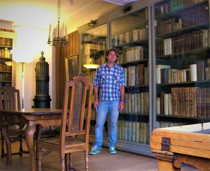 Había pasado de largo el segundo piso pero enmendé el error y me sumergí en la nutrida biblioteca familiar con 2000 libros que abarcan todos los campos del saber. Aquí pasaba horas el joven escritor investigando. Me hice una foto junto a una vitrina que contiene varios ejemplares imaginándome al poeta en su febril actividad creativa.