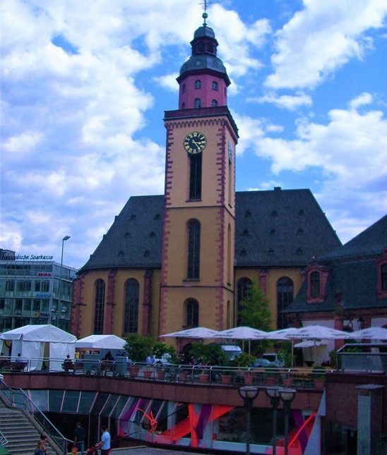 Lo primero que vi al salir del túnel de la estación de subte Hauptwache fue la iglesia evangélica de Santa Catalina erigida en 1678. Como casi toda Frankfurt, fue destruida por los bombardeos aliados durante la Segunda Guerra Mundial pero se la reconstruyó en 1954.