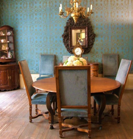 Allí se ve el retrato de un joven Goethe. El salón comedor o sala azul debe su nombre a este color que en esa época estaba de moda para decorar ambientes. Las paredes y el tapizado de las sillas lucen este tono. La cocina tenía bomba de agua lo cual era un lujo en ese tiempo porque evitaban tener que salir a recogerla con baldes en los pozos públicos de la ciudad.