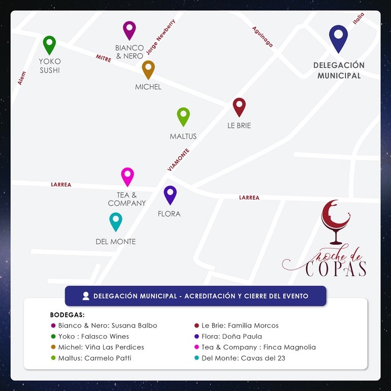 En esta oportunidad, las paradas del circuito serán en Bianco & Nero, Yoko, Michel, Maltus, Le Brie, Flora, Tea & Company y Del Monte. En tanto que las bodegas participantes serán Susana Balbo Wines, Falasco Wines, Viña Las Perdices, Carmelo Patti, Familia Morcos, Doña Paula, Finca Magnolia y Cavas del 23.