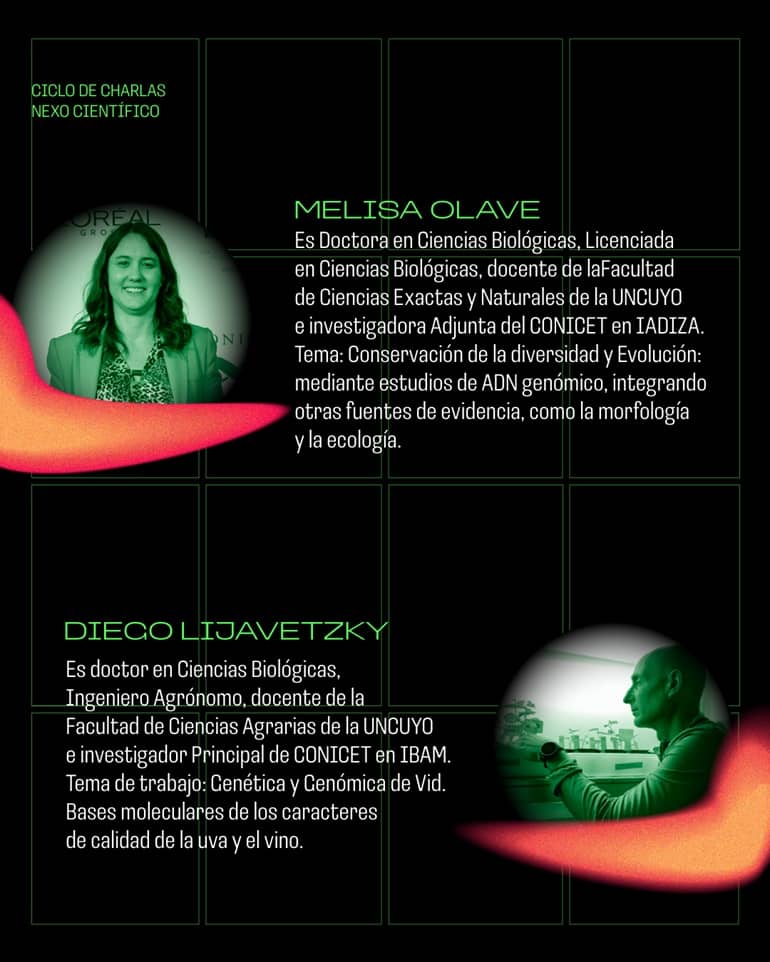 Diego Lijavetzky enfocará su presentación en la genética y genómica de la vid, profundizando en los caracteres que definen la calidad de la uva y el vino. Por su parte, Melisa Olave abordará la conservación de la diversidad biológica desde una mirada evolutiva, integrando estudios de ADN con información morfológica y ecológica.