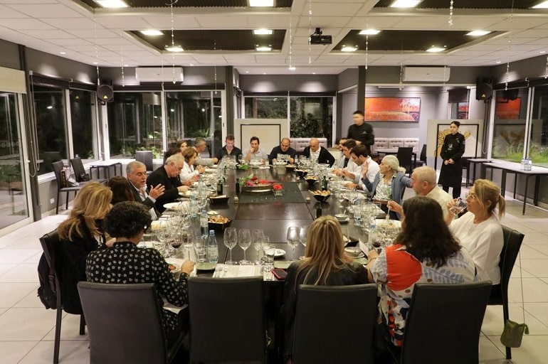 Luego de algunos brindis y charlas en los jardines del restaurante, los invitados pasaron a la gran mesa y allí degustaron un menú de tres pasos: Dúo de pastas (capelleti San Martino y paglia con tomate fresco y albahaca); Chivo en dos cocciones con pizzico di verde; y de postre, Diplomático con frutas frescas y quesos con dulces regionales.