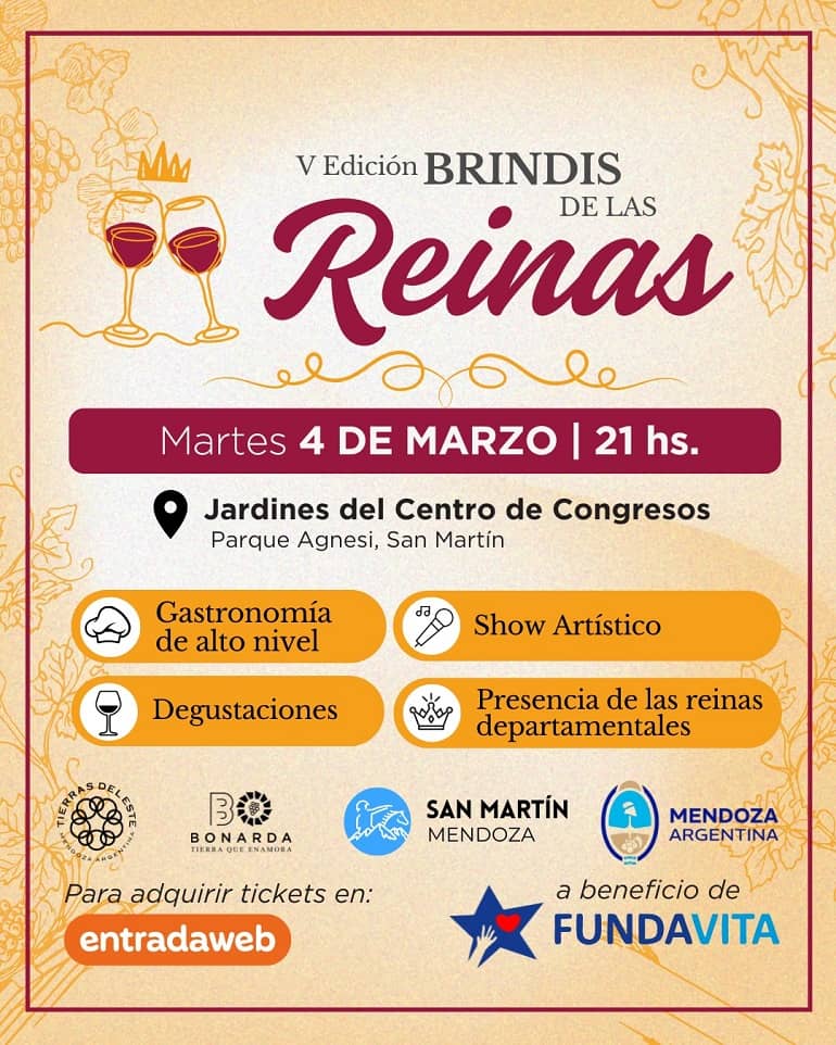 El próximo martes 4 de marzo, a las 21, el Centro de Congresos y Exposiciones Francisco, en el Parque Agnesi de San Martín, será el escenario de la V Edición del Brindis de las Reinas, un evento que reúne a destacadas personalidades del ámbito político, empresarial, cultural y deportivo, junto a las soberanas departamentales, con un propósito solidario en beneficio de FUNDAVITA.