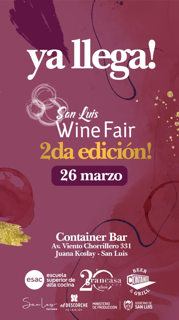 Este sábado 26 de marzo llega a Juana Koslay, la 2da edición de “San Luis Wine Fair”. Más de 25 bodegas de Mendoza y San Luis presentarán una especial selección de etiquetas de media y alta gama en una jornada imperdible. Vinos, gastronomía y música en los jardines de El Container Bar. Las entradas están a la venta.