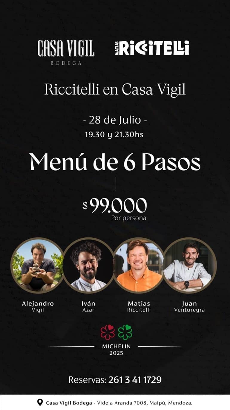 El próximo lunes 28 de julio, la bodega Casa Vigil será el escenario de un encuentro excepcional que une lo mejor del vino y la alta gastronomía argentina. Los reconocidos enólogos Matías Riccitelli y Alejandro Vigil compartirán por una noche sus talentos junto a los chefs Iván Azar y Juan Ventureyra, en una propuesta que promete ser inolvidable.